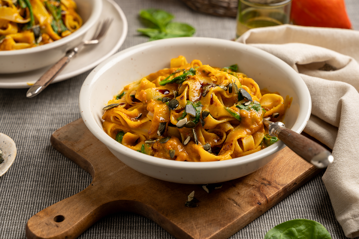 Eine würzige, vegane Pasta mit Hokkaido-Kürbis und ein bisschen Spinat. Herbst pur.