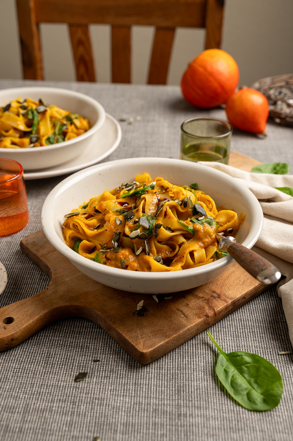 Bandnudeln in würziger Kürbiscremesoße mit Spinat, Kürbiskernen und Kürbiskernöl.
