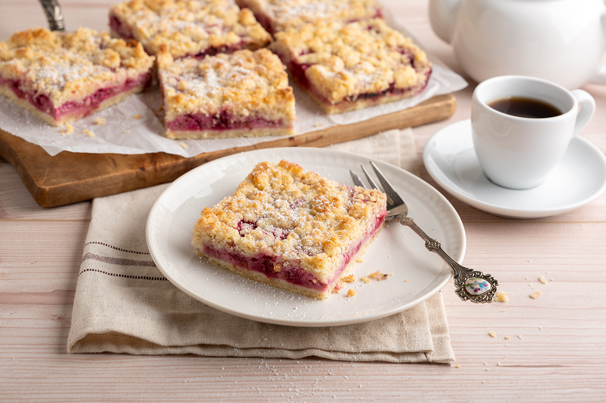Ein fruchtiger veganer Blechkuchen mit Himbeeren und ganz viel Streuseln.