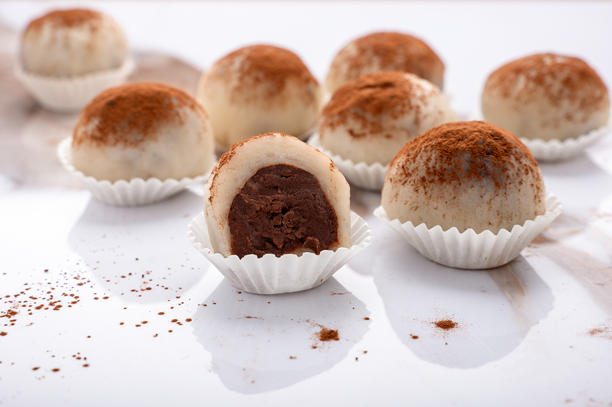 - Etwas Speisestärke (nicht viel!) auf die Arbeitsplatte sieben.Den Mochi-Teig darauf geben und mit einem Messer in 10 gleich große Stücke zerteilen (auch hier habe ich abgewogen) und sofort Kugeln daraus formen. Die Temperatur sollte jetzt nicht mehr allzu hoch sein.Nun jede Kugel auf der Handfläche platt drücken und dabei den Rand ringsum dünner ausarbeiten als die Mitte (sonst haben wir an der Verschlussnaht am Ende zuviel Teig und oben könnte er reißen).In die Mitte eines jeden Teiglings eine Kugel der Füllung (frisch aus dem Kühlschrank) setzen, übrigen Teig darüber schlagen und gut verschließen. Gegebenenfalls vorsichtig noch etwas rund rollen. Das Ganze braucht etwas Geschick und Geduld, aber das bekommt Ihr hin.Mit dem Verschluss nach unten auf einen Teller (bestenfalls mit einem Stück Backpapier ausgelegt) setzen. Alle Kugeln nacheinander so verarbeiten.Zum Abschluss optional die Kugeln mit etwas Backkakao bestäuben. Fertig!