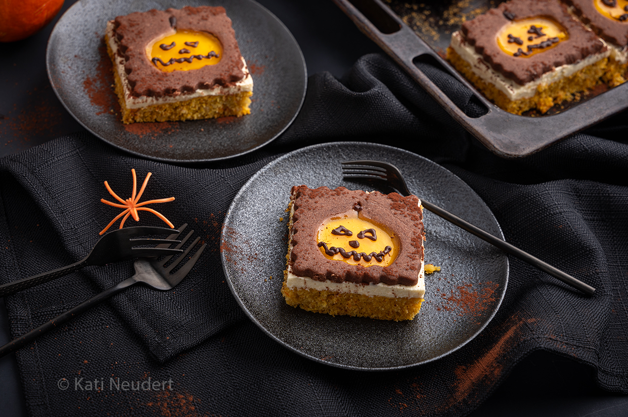 Veganer Blechkuchen zu Halloween aus einem Rührteig mit Kürbis, Vanillebuttercreme, Schokokeksen und Orangengelee.
