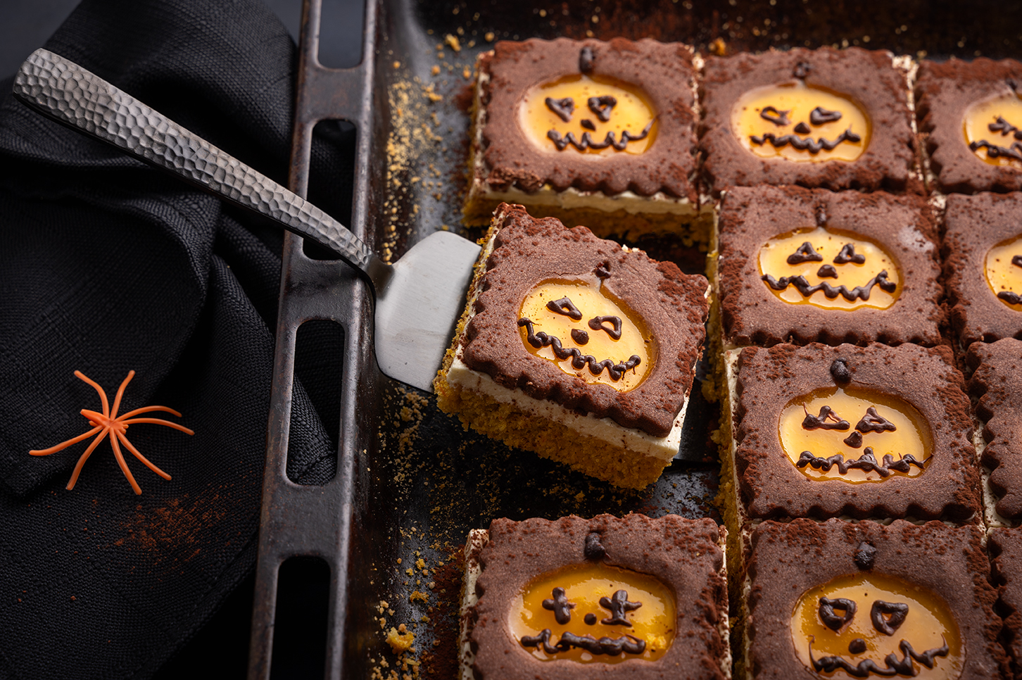 Veganer Blechkuchen zu Halloween aus einem Rührteig mit Kürbis, Vanillebuttercreme, Schokokeksen und Orangengelee.