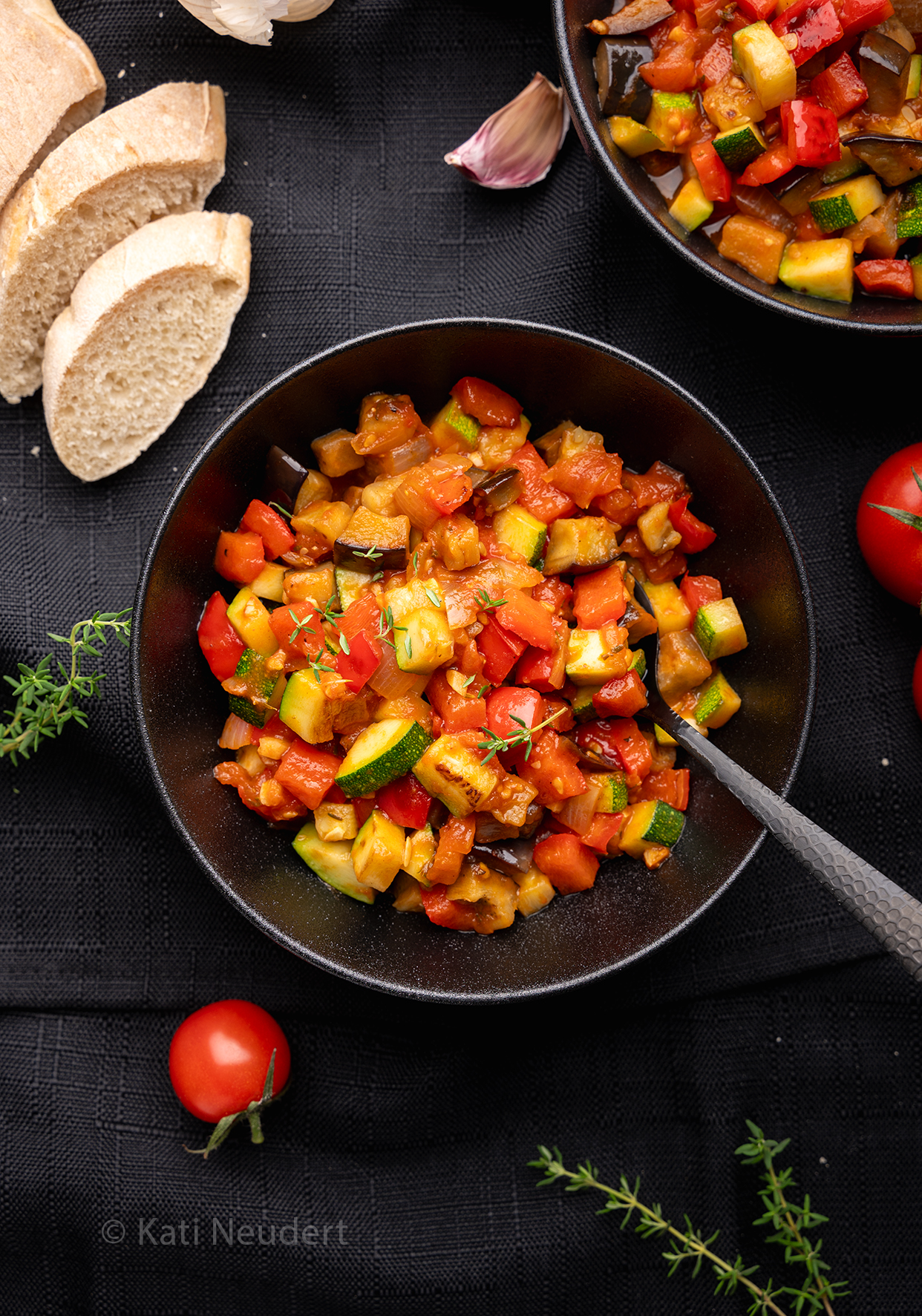 Klassisches Ratatouille aus Zucchini, Aubergine, Parika, Tomaten, Knoblauch und Zwiebeln (Französische Küche). Vegan.