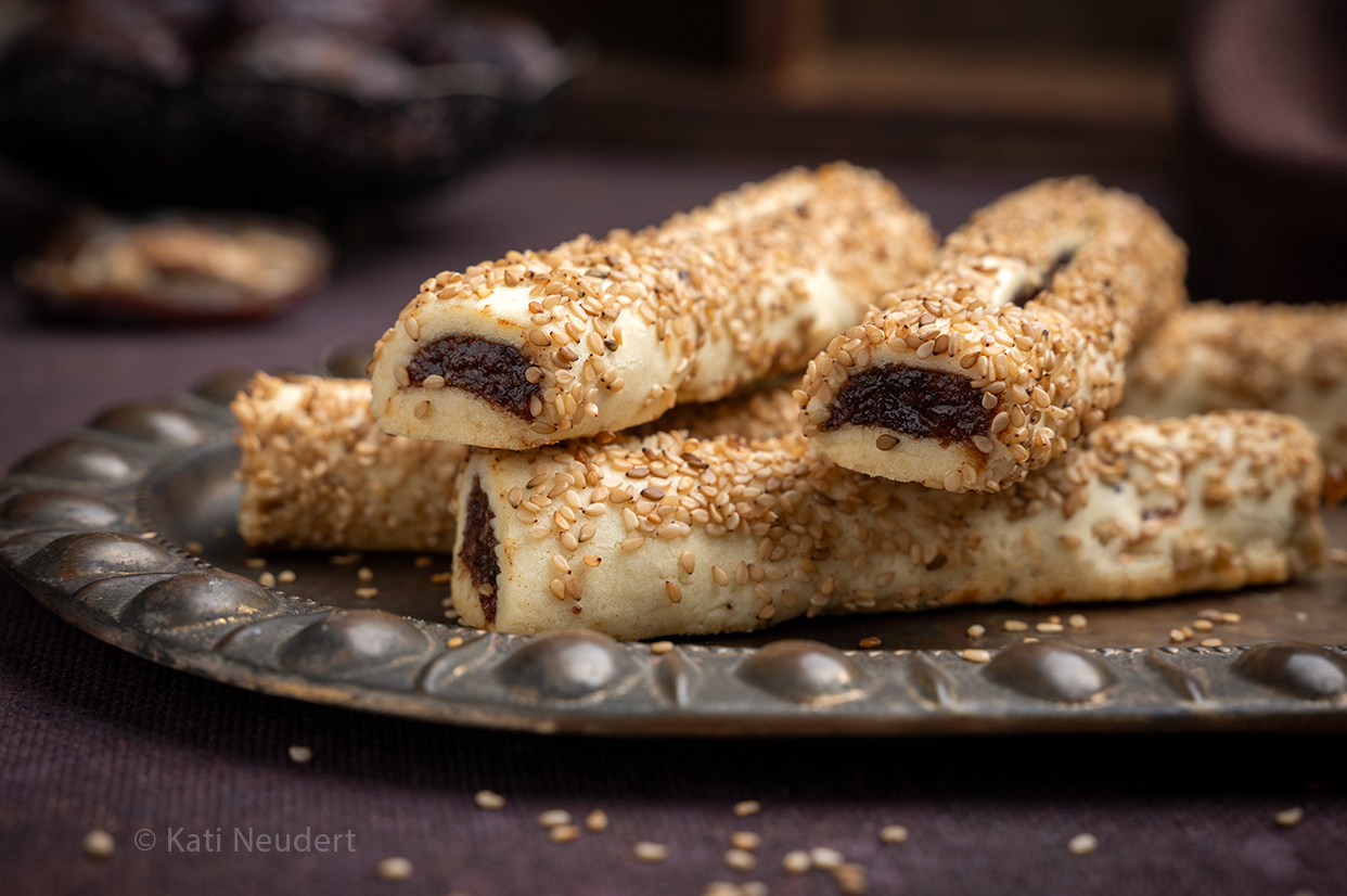 Vegane Dattelfinger: Weiche Mürbeteigrollen, gefüllt mit Dattelpaste und ummantelt mit hellem Sesam.