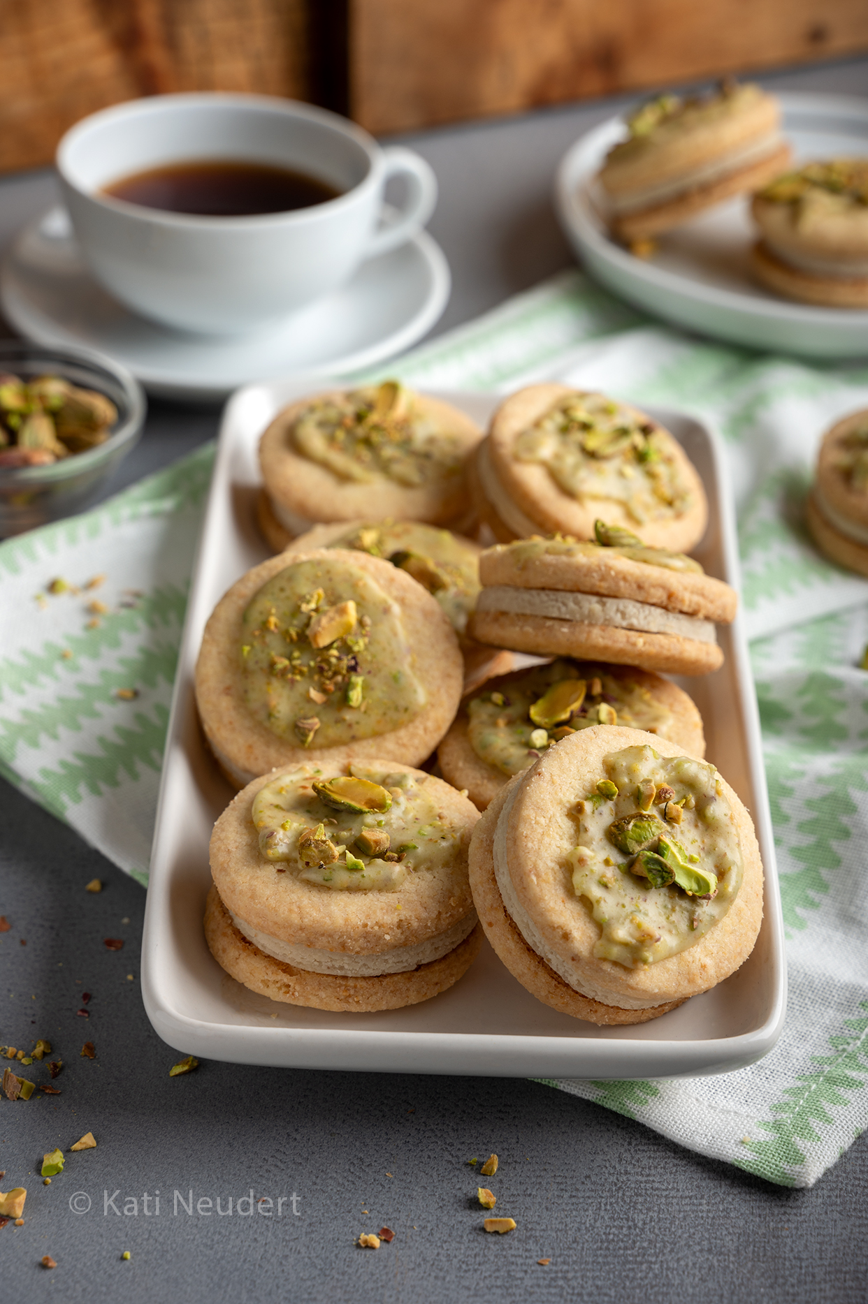 Vegane Doppelkekse mit Mandelfüllung und Pistazienglasur.