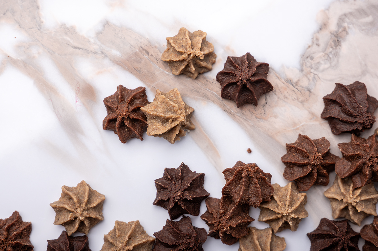 - Die Masse in den Dressiersack geben und pro Variante etwa 50 kleine Sterne aufspritzen.Kalt stellen. Genießen!