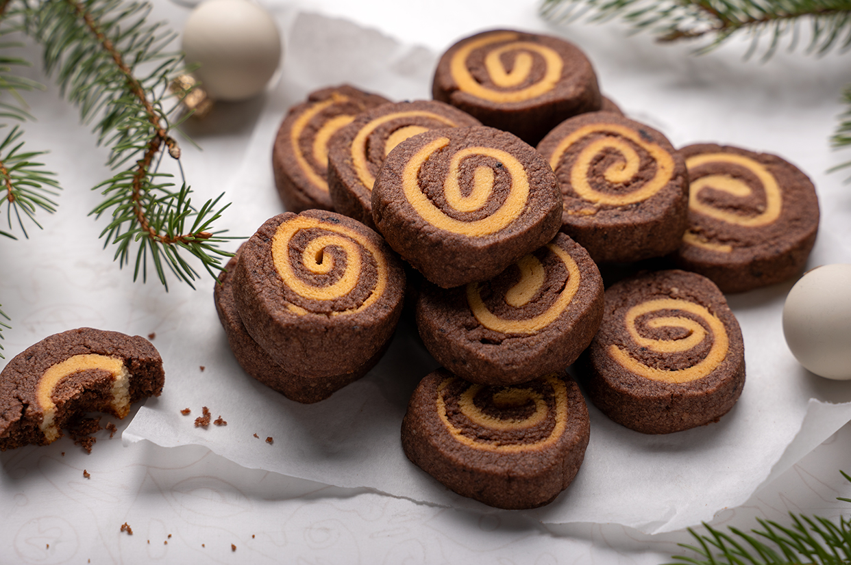 Es handelt sich um einen mit Kakao und Mandeln angereicherten Mürbeteig. Nach dem ausrollen wird eine dünne Marzipanplatte aufgelegt, alles zusammen gerollt und in Scheiben geschnitten. So einfach! Das Marzipan karamellisiert ganz leicht beim backen. Das duftet und schmeckt so herrlich.