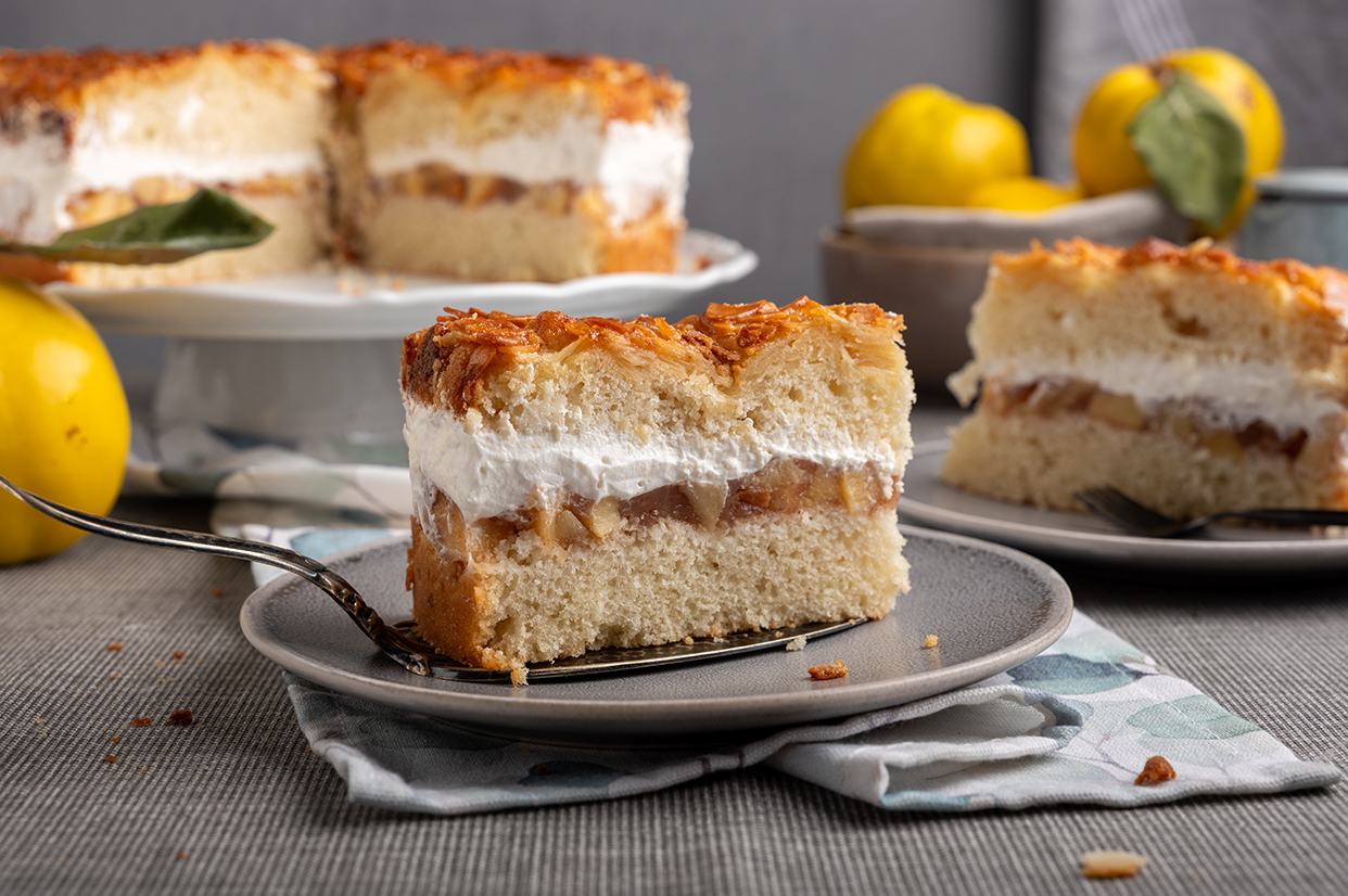Lockerer Biskuit mit Mandelhaube trifft Quitte und weiße Schokoladensahne.