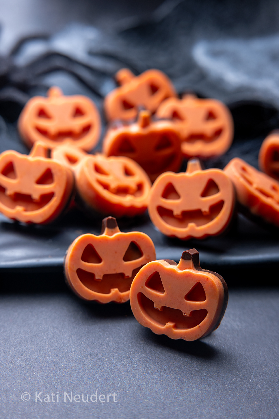 Vegane Schokolade mit Kürbisgewürz in Halloween-Kürbis-Form.