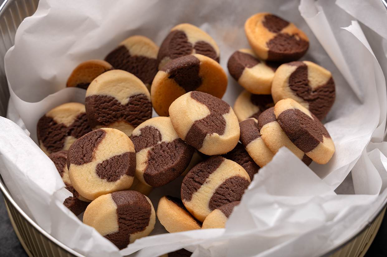 Das Schwarz-Weiß-Gebäck ist vegan. Es kommt ohne Ei, ohne Butter und sonstige Zutaten tierischen Ursprungs aus.